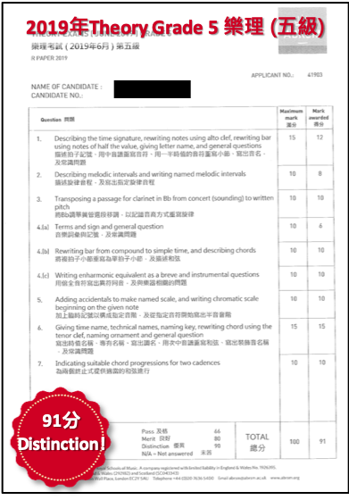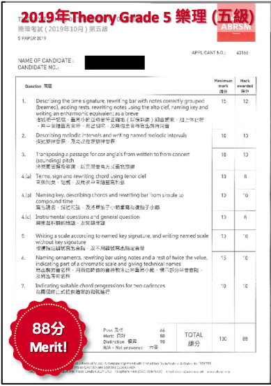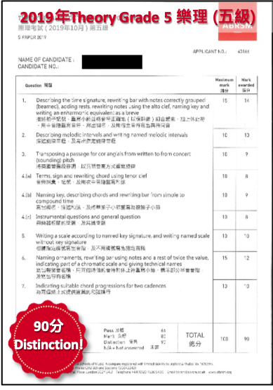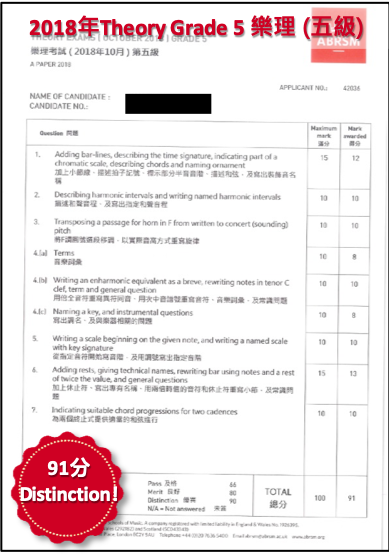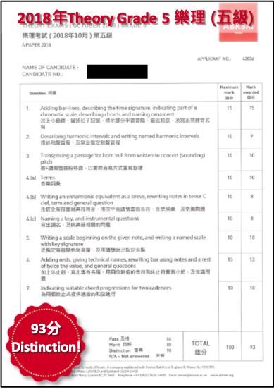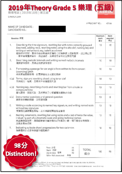 考試成績極佳,曾有同學在5級樂理取得98分之高分Distinction!
